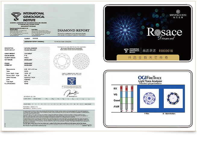 In view of the brilliance of Rosace, the international authoritative identification agency IGI has specially issued a quality certificate to establish a new diamond ratings standard.